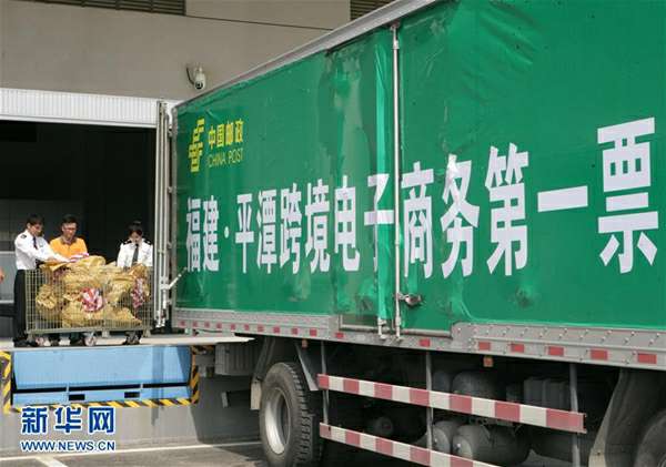 福建平潭海关工作人员和福建省邮政速递物流有限公司工作人员将检查好的邮包装运往一线口岸,这是福建跨境电商第一单(2014年11月5日摄)。新华社记者 林善传 摄