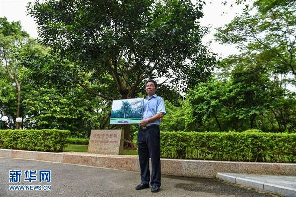 原莲花山公园管理处主任杨义标在习近平手植树旁展示当年种下的小树照片(9月7日摄)。新华社记者 毛思倩 摄